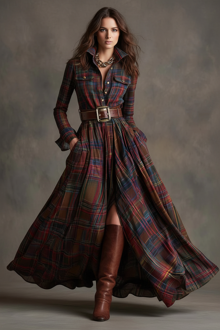 Beatriz · Vestido Largo de Cuadros con Cinturón