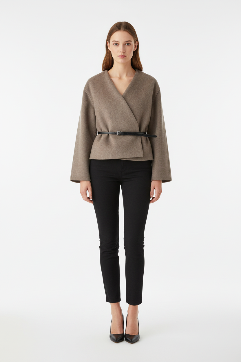 El abrigo Nahia combina suavidad, ligereza y un estilo minimalista que realza cualquier atuendo. El diseño cruzado con cinturón define delicadamente la cintura, proporciona calor sin ser pesado. En un tono taupe neutro y refinado, se convierte en una pieza versátil para la temporada de transición, perfecta para primavera o días frescos de verano.