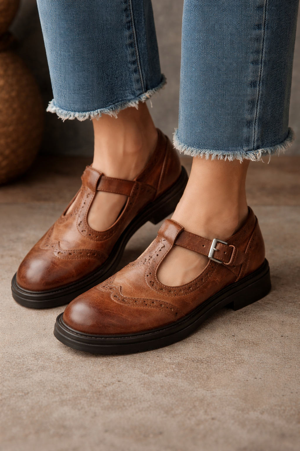 Estas clásicas Mary Janes tienen una puntera redondeada y detalles inspirados en el estilo brogue para añadir un toque de encanto. La tira en T con hebilla lateral ofrece un ajuste seguro, mientras que la suela plana y duradera proporciona comodidad y estabilidad durante todo el día. Una opción ideal para combinar el estilo vintage con la practicidad moderna.