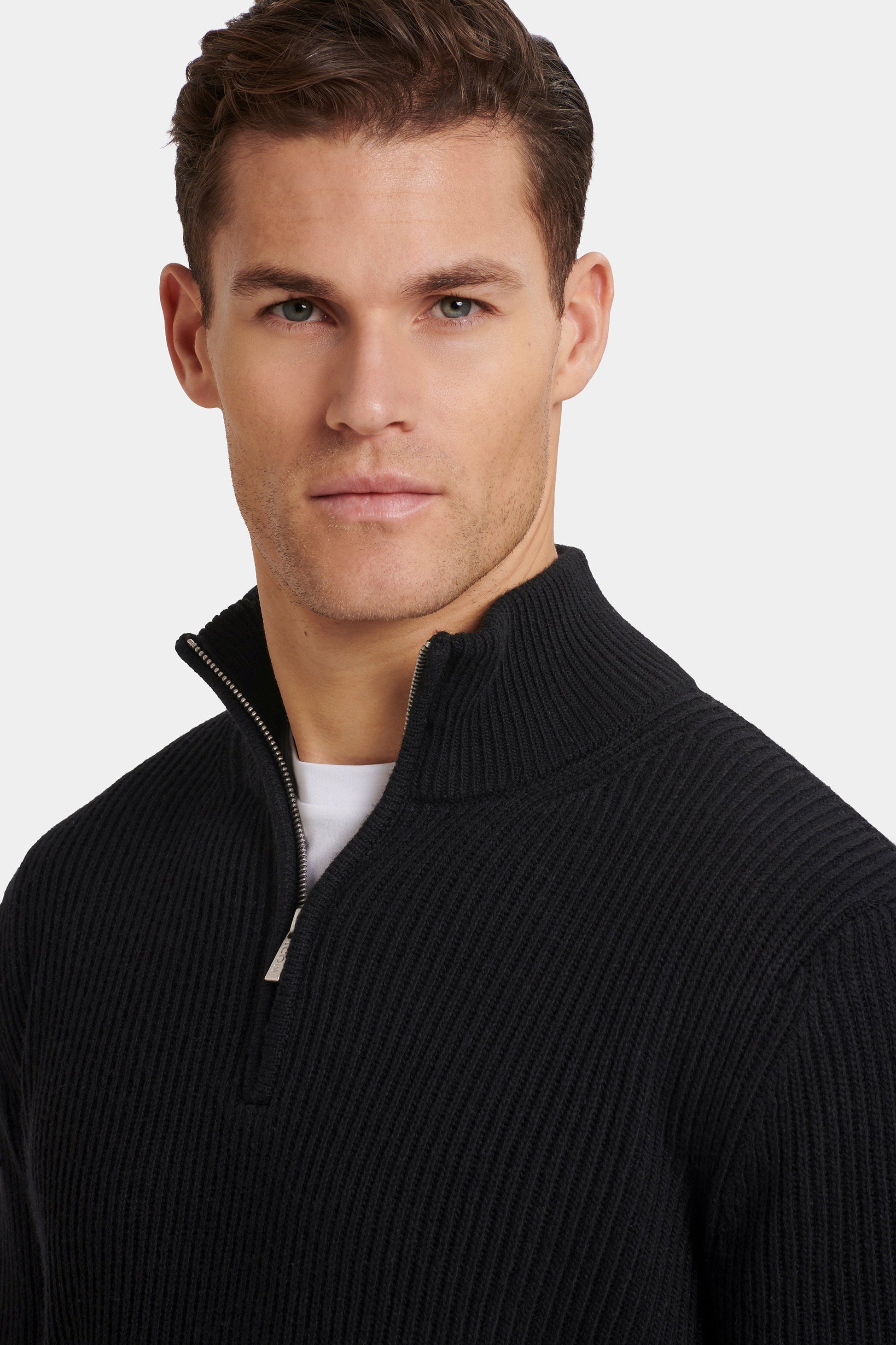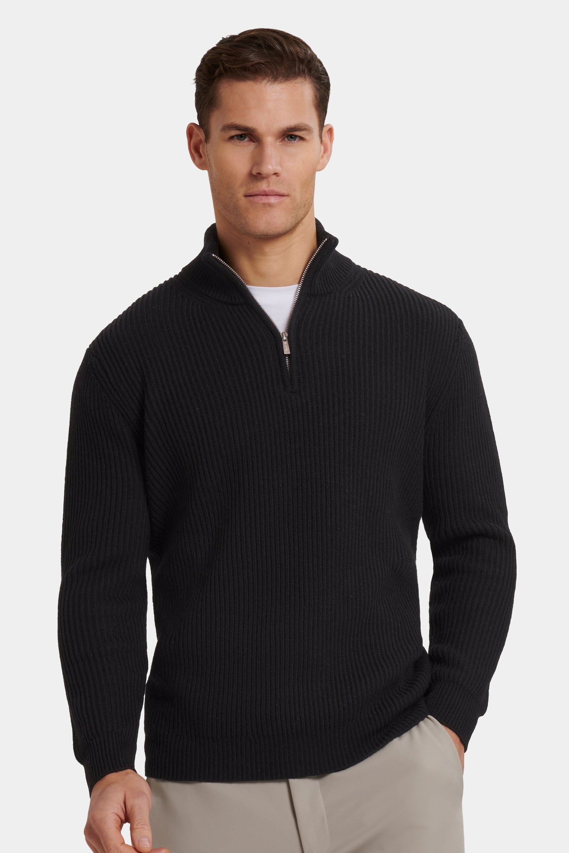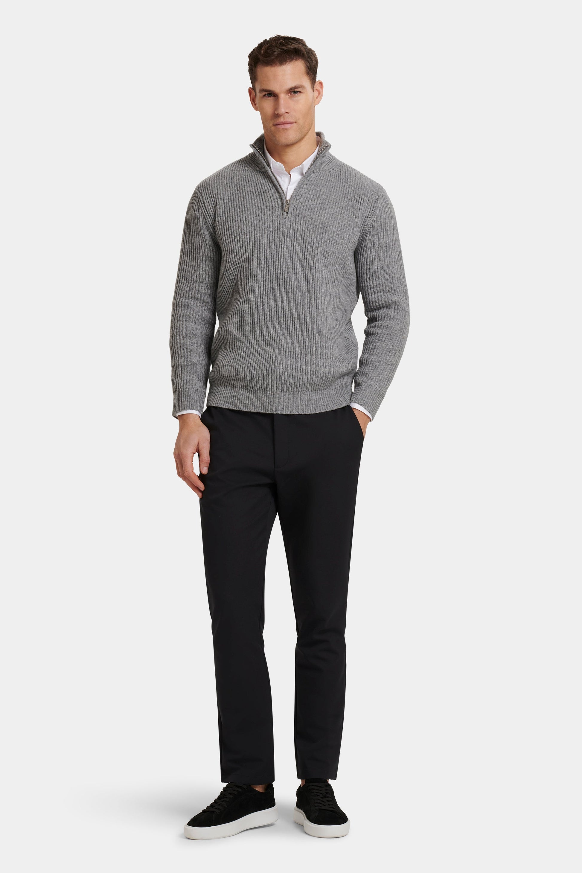 Su corte entallado realza la silueta y mantiene la forma a lo largo del día. El cuello alto acanalado y la cremallera de un cuarto personalizada con la firma Abril Valenciano aportan un acabado refinado y distintivo, equilibrando funcionalidad y estilo.