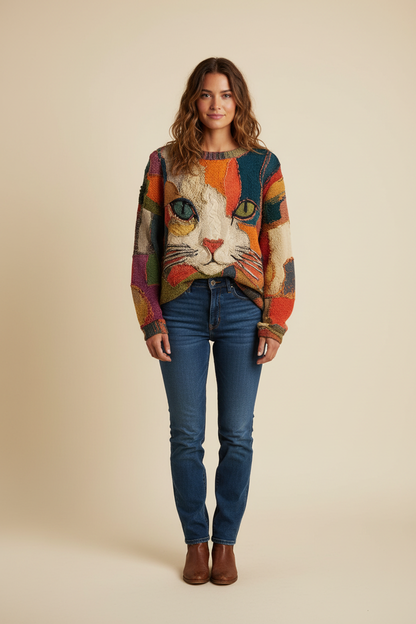 ✔︎ Diseño artístico único – Cara de gato en patchwork, ideal para un look creativo y original.